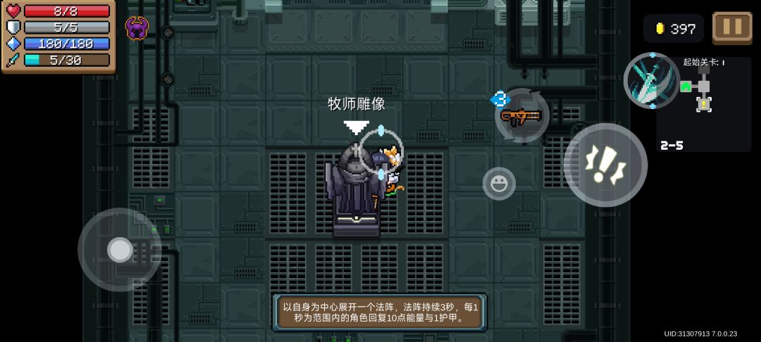 9.【牧师雕像】——以自身为中心展开一个法阵,法阵持续3秒,每1秒为范围内的角色回复10点能量与1护甲。