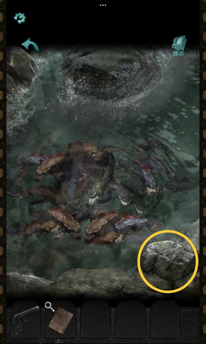 点击池塘,拿起旁边的石头砸向鱼群,打开背包,获得【斧头】查看笔记本,点击远处的树,用斧头砍,获得【长树枝】用长树枝过桥,点击衣服获得【证件】点击窗户使用证件获得【钥匙】进入祠堂