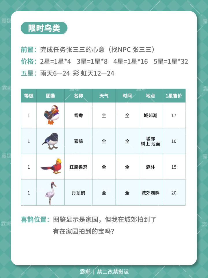 心动小镇 新春季限定4种鸟类图鉴售价