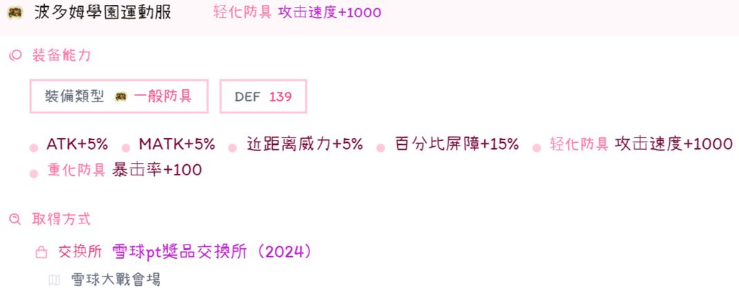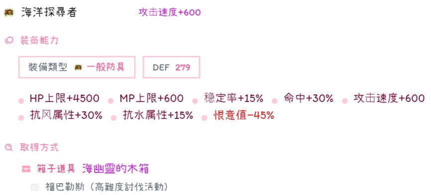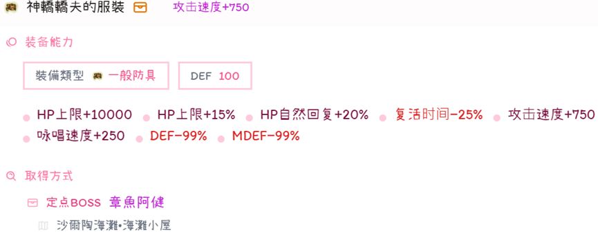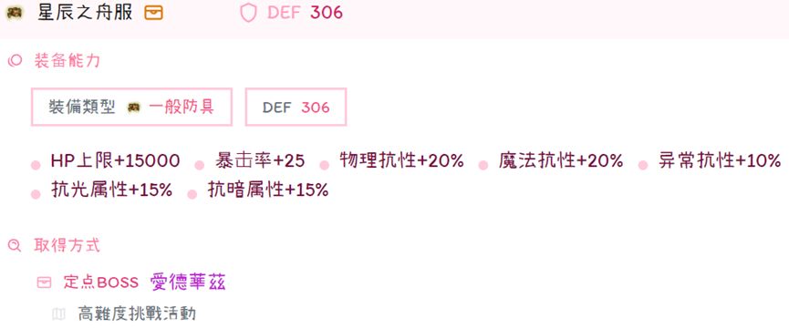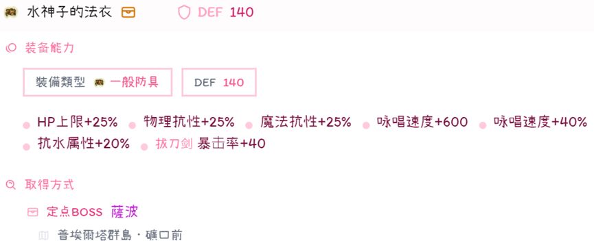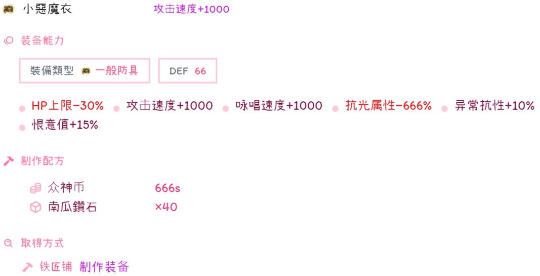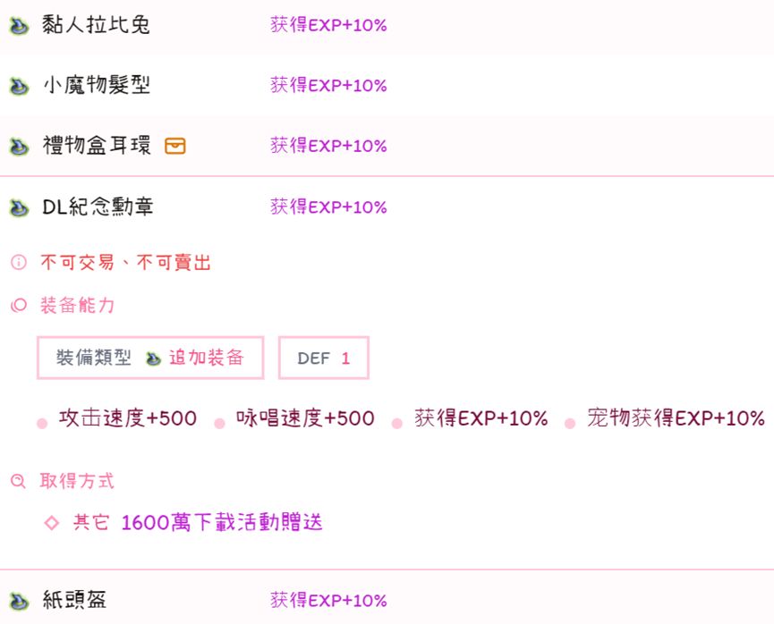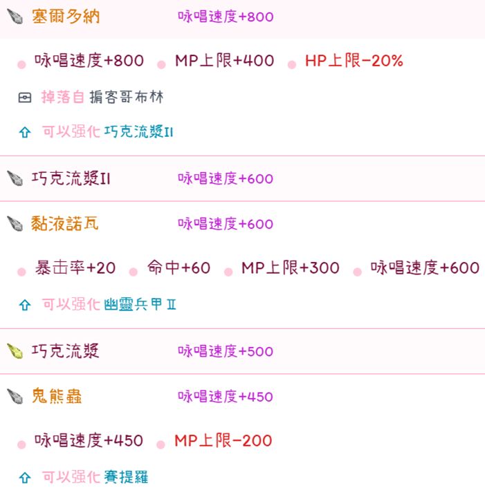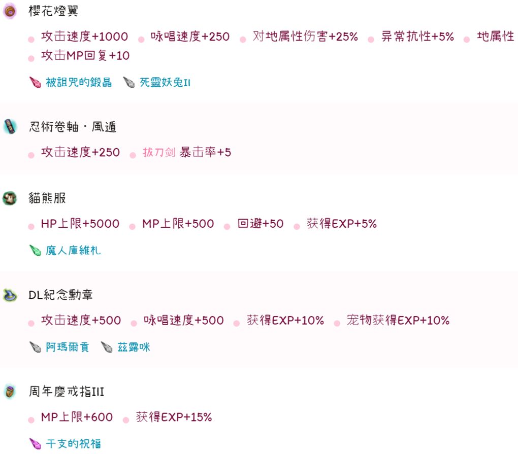 这套装备仅为加快升级的速度而考虑。然而,考虑到部分新玩家和回坑玩家可能错过DL纪念勋章或樱花灯翼,以及满级后将此角色当做普通灵魂电宝使用的情况,在此列出一些关键装备或锻晶供大家参考。以下装/锻均不考虑属性分配点agi/dex的情况,即默认基础攻速369(90+1×4+1×0.2+275),轻化防具+184,基础唱速279(1×2.94+1×1.16+275)