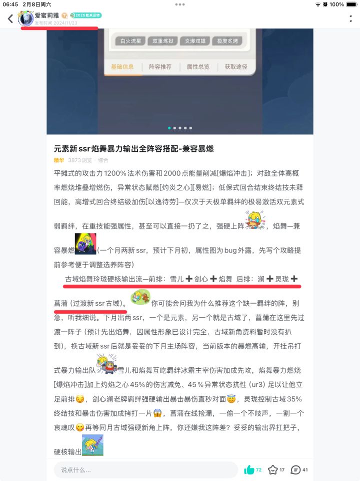 (见图三,荣耀越战五亿,超自身50%战力)😏 雪儿首位先攻焰舞互为羁绊,一脚下去1/3高概率叠满灼炎,开局零帧起手2000减能直接干灭对面发动机😶🌫️,暴力燃烧[爆焰冲击]加上灼焰之心45%伤害减免异常状态抗性(ur3)足以让焰舞立足前排😏,剑心澜老牌羁绊强硬输出暴击暴伤直秒对面😇,灵珑控制古域35%终结技和暴击伤害加成拷打一片,或加装二阶25%笼中雀,主免控70%减伤[铩羽]伺候😱,司命无敌奶触底式瞬回血,伤害直线起飞🤯虽有罪欲硬控爆发众生平等,但仍是当之无愧的版本t0,输出的数据怪