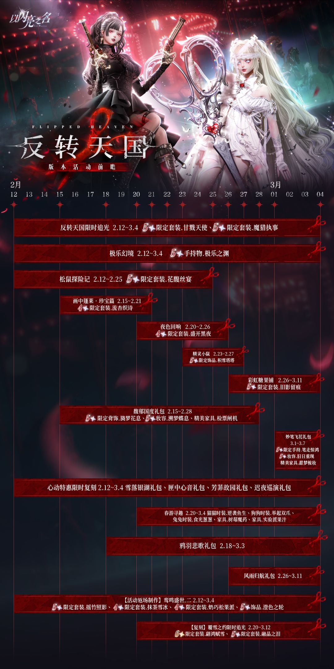2月12日更新后,限定追光活动【反转天国】上线!全新五星套装及SR羁绊限时登场!该追光活动每登场10次内必获得SR羁绊或限定五星套装部件(直至集齐所有限定五星套装)。此外,【反转分解】商店也将同期限时开启,通过分解该限时追光活动内的服饰,可获得限定时装部件【夜探花篱】、【云绒甜梦】、【茸茸心事】、动态拍照动作【曼舞流歌】、拍照动作【绣扇怀思】及头像框、反转风向标、心念之蝶、知之钥、金币等材料道具!