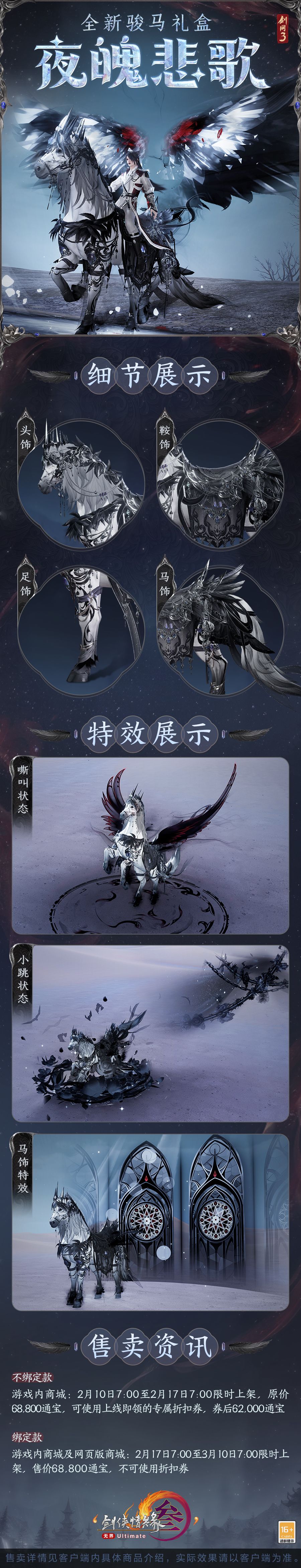 ”清光破月,夜色揽星,骏马礼盒“夜魄悲歌”飒沓而来。白驹踏月,鬃毛若深夜薄雾泛银灰光泽。玄黑马鞍镶嵌鎏银紫钻,高贵而又华丽;再饰以乌色翎羽,桀骜难驯,深沉不凡。骏马奔驰之时有荆棘玫瑰默然盛放,冰冷铁链惊起蝙蝠若干。荆棘的锋利、玫瑰的傲然、铁链的束缚,骏马嘶叫昂头,血色亦作羽翼光泽,慑人心弦。专属马饰特效开启后,暗色能量波动震荡,琉璃悬窗蜃影忽现,精致线条交织成神秘而又庄严的花纹。光影交错,深邃黑色羽翼倏尔展开,仿佛跃入梦幻之境。