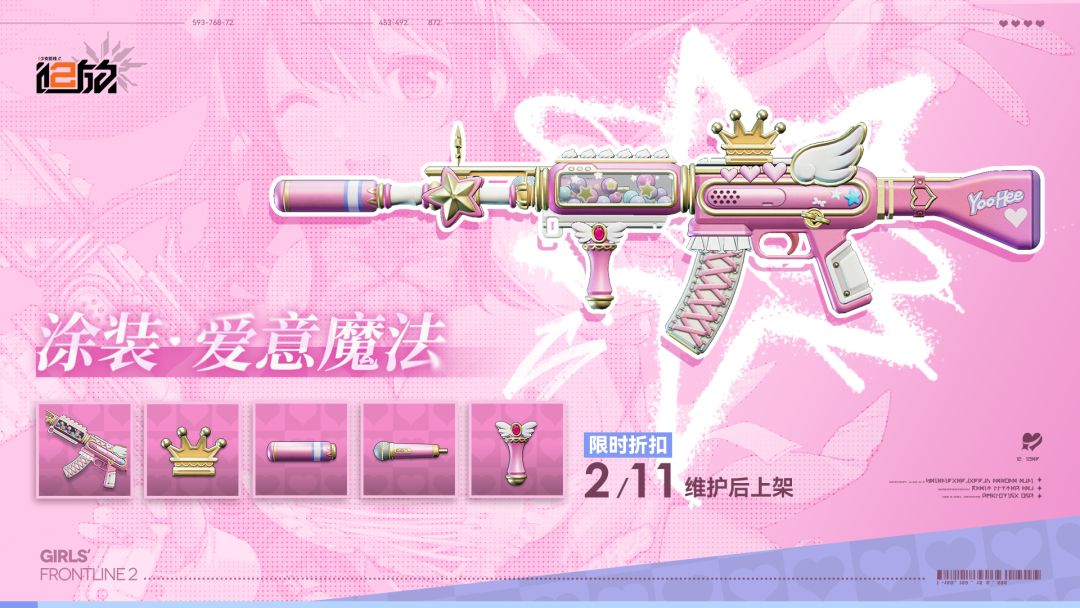尊敬的指挥官,2月11日维护后~3月4日7:59 期间,全新主题套装【涂装·爱意魔法】将限时上架个性涂装商城,并开启折扣售卖,购买后将立即获得武器涂装及4件配件涂装,欢迎指挥官届时前往选购。