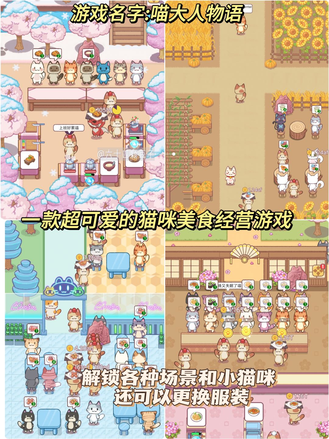 简介:一款超可爱的猫咪美食经营游戏,解锁各种场景和小猫咪,还可以更换服装