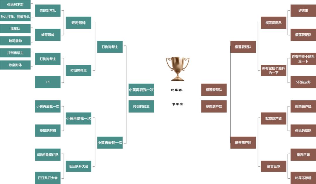 第一轮抽签榴莲会进行直播抽签,保证分组的公平性。一共19个队伍,让他们起了新的战队名字,这样一来,更有娱乐性更专业,鼓励他们越骚越好。有几个战队名很有趣,跟大家分享一下,比如“打倒狗帮主”是我们战队,这个名字也代替了大家的心声,都想揍我。可谓是爱之深恨之切吧。帮派里还有一个人叫蛙哥,平时大家对于策划蛙哥不满也会顺带怼一下他。