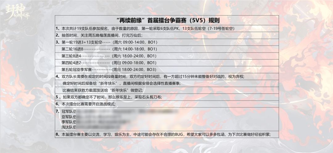 当然可以,在此期间也遇到过许多困难,比如在等擂台激斗功能,而且我们发现报名的队伍不等于16/32组这样的数字,于是我们内部管理层商量后决定采取第一轮大轮空形式;报名队伍少,因为大家年前时间有限,于是我们将比赛时间缩短,除了前三名争夺,剩下比赛均为bo1,其次双方队长互相商量时间,如果双方都没有时间可以采取猜拳定胜负,毕竟娱乐至上。