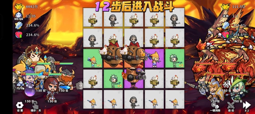 到boss了,我们不用剑走偏锋,王道阵容锤手+喵+鸡。上个岛应该把你拖出来的喵打没了,那么第一场拖一个紫锤,然后就互换棋子把步数用光,目的是不要消出喵省下buff,上来紫锤砸一下,甚至不用开紫鸡技能(如果前面都开了的话),基本上4个伙伴都不会挂。第二场开始全力攒鸡拖出,+50 60就够了,有紫锤就拖,boss上来锤手砸一下,敌方伙伴死一死开所有🐔哥的技能,结合喵的buff世界和平。注意锤手一下就够,不要连续开。