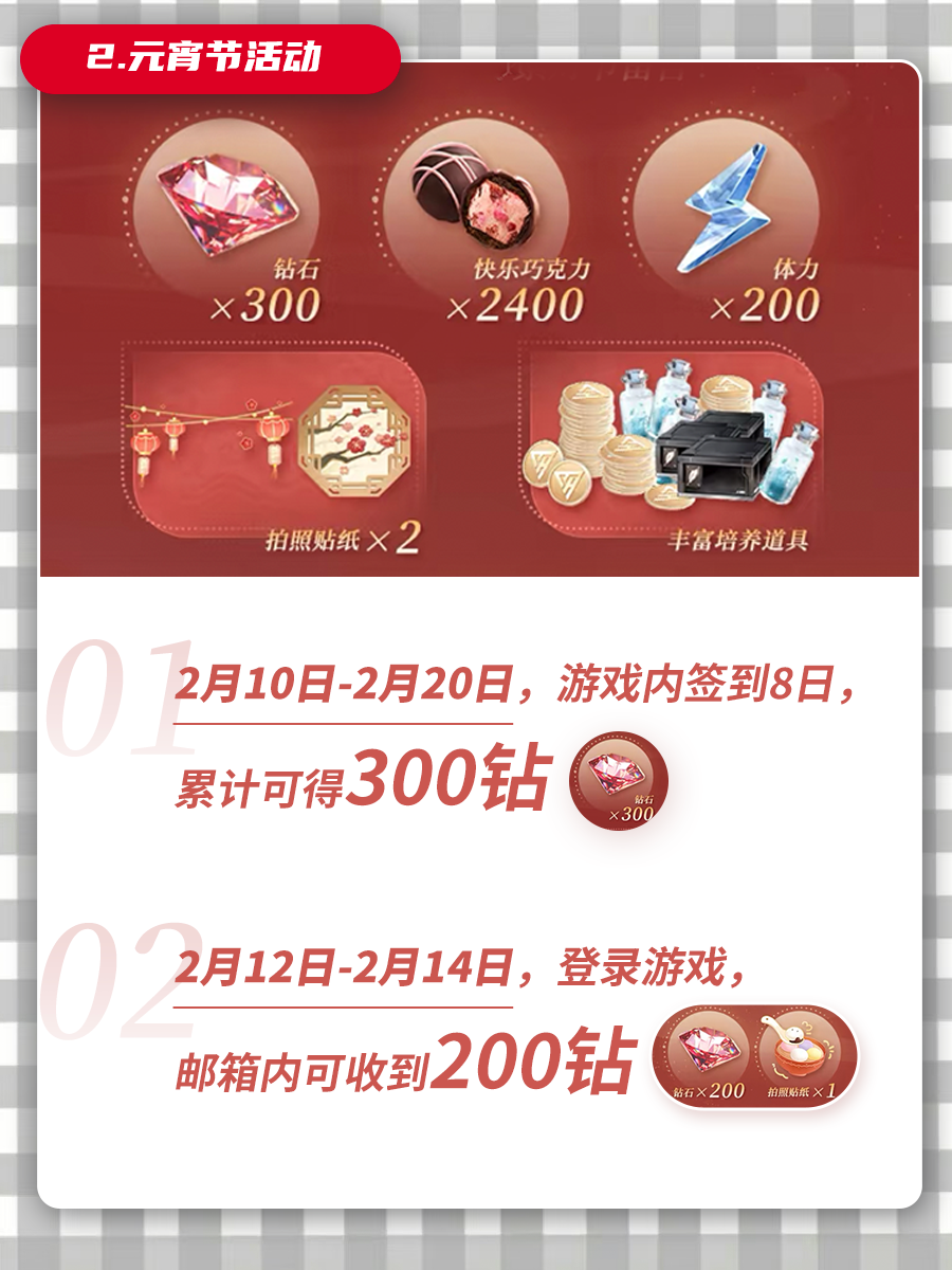3️⃣ 2月12日-2月14日,登录游戏,邮箱内可收到200钻