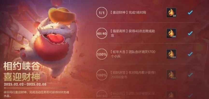 峡谷同行,喜迎财神!截止至2月8日(今日),召唤师完成活动任务即可获得龙魂水晶*888好礼~