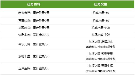 灯火映峡谷 欢喜闹元宵元宵佳节欢聚峡谷!即日起,截止至2月16日23:59,召唤师累计登录7天可领奥瑞利安·索尔炫彩皮肤与龙魂水晶*300好礼!