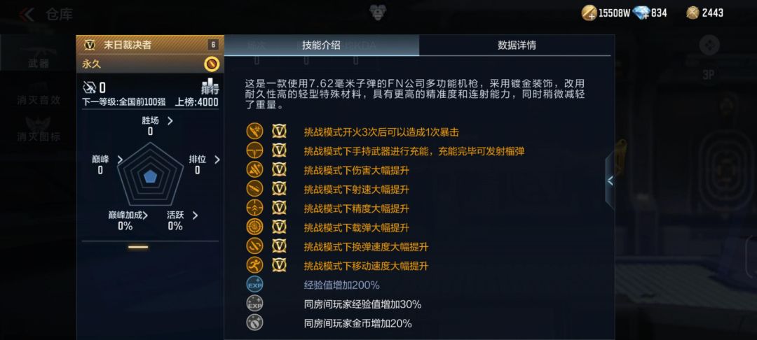 接下来就到了末日裁决者的优势区间挑战模式环节,打开武器介绍面板我们可以发现末日裁决者拥有多达8条的V标属性,不愧是“王者苍雷”。无论是伤害射速精度载弹量还是换弹速度移动速度都有全方位加强。