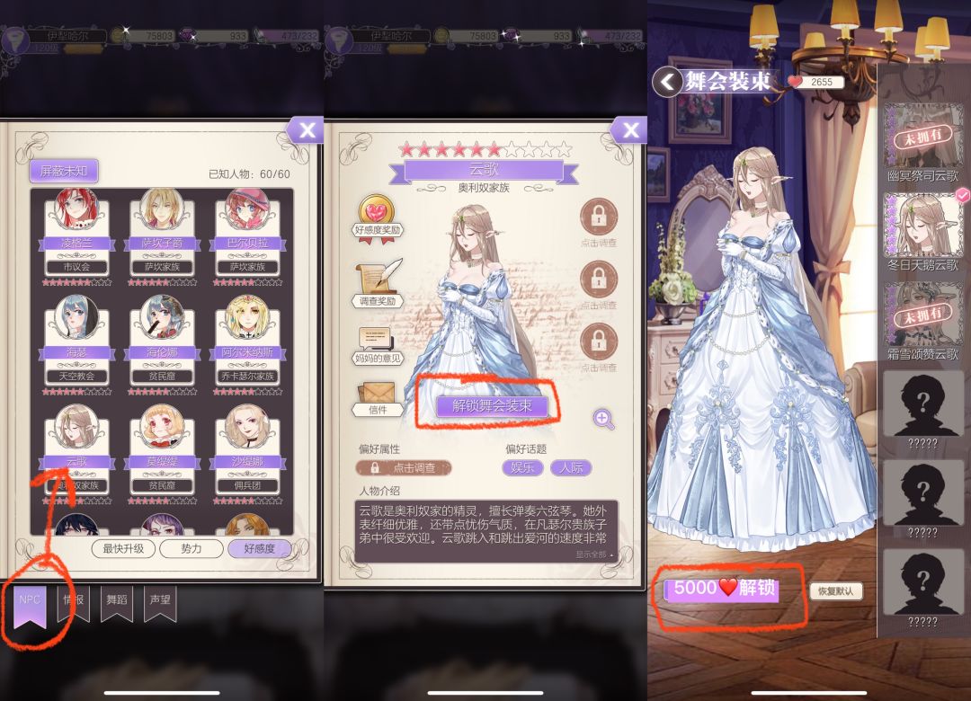 点击资料在NPC栏找到想换皮的人物点击🔓解锁舞会装束,选择后花5000爱心解锁使用,跟丑皮bye