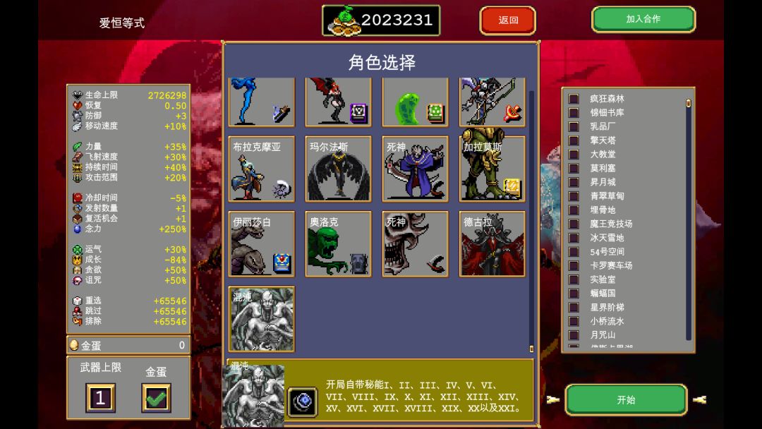 新DLC翡翠模型等有空再肝,怪物还意外得强,升级加力量的角色后期除了混沌其他角色都打不动怪了,虽是免费DLC,但门槛还挺高,没买DLC的建议选西格玛女王+武器无限升级+大蒜和月桂的超武回血和减伤,买全DLC的干脆选极恶德古拉,留3个武器位关武器无限升级防画面遮挡、光污染。