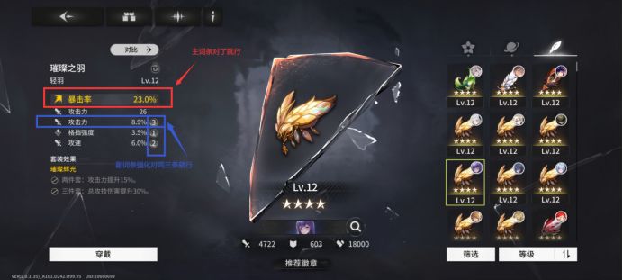 该图为{五星}(暗·异刃)角色黑羽的特殊效果,故而在主词条选择时会优先选择[移速],更多类似的角色特性,就不过多说了,期待各位自己发掘或是从其他大佬出知悉,本篇就不过多赘述了。