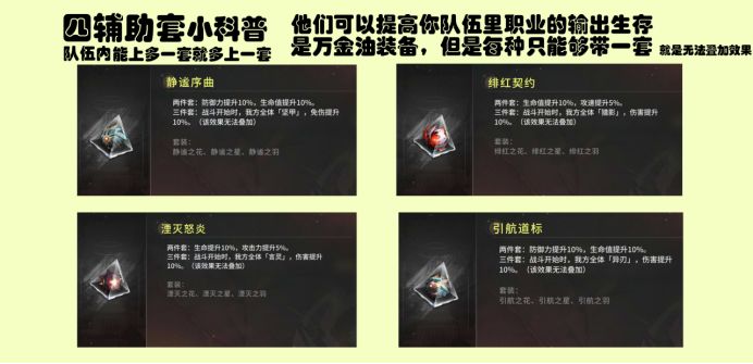 辅助套因为不能重叠的特点,所以最多只能带四套不同的套装,一般根据队伍需求自行进行分配,同时也是最不需要考虑词条的一类徽章,即使是没有强化过的也可以使用,毕竟都带辅助套了,谁会在意你输出多少呢?真在意也是最后再考虑的了