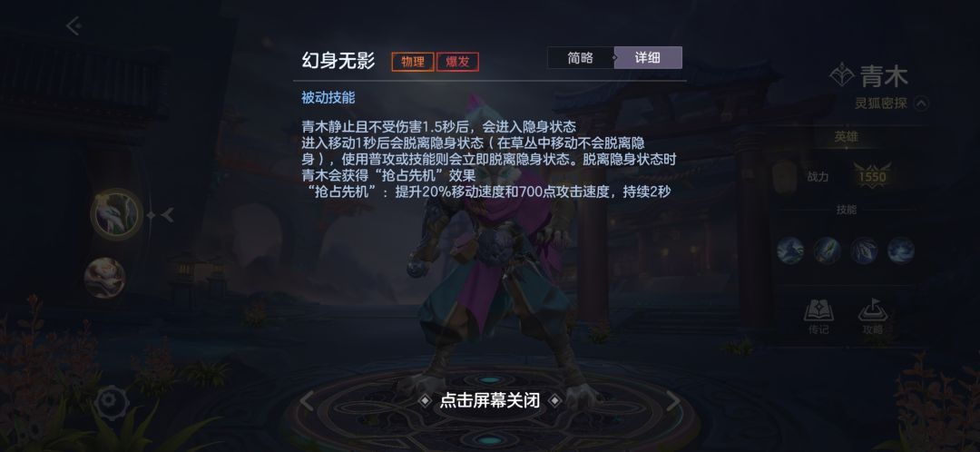 青木静止一定时间会进入隐身状态,进行移动一秒后会脱离隐身状态(普攻或者释放技能会立即脱离隐身状态,在草丛移动不会脱离隐身状态)。脱离隐身状态青木会获得移速以及攻速的加成,前期利用这一特性搭配一技能可以打出不俗的爆发非常好用。需要注意的是青木隐身期间受到强制位移的控制(击退、嘲讽此类),都会使自身现行。隐身时注意别被人发现哦~