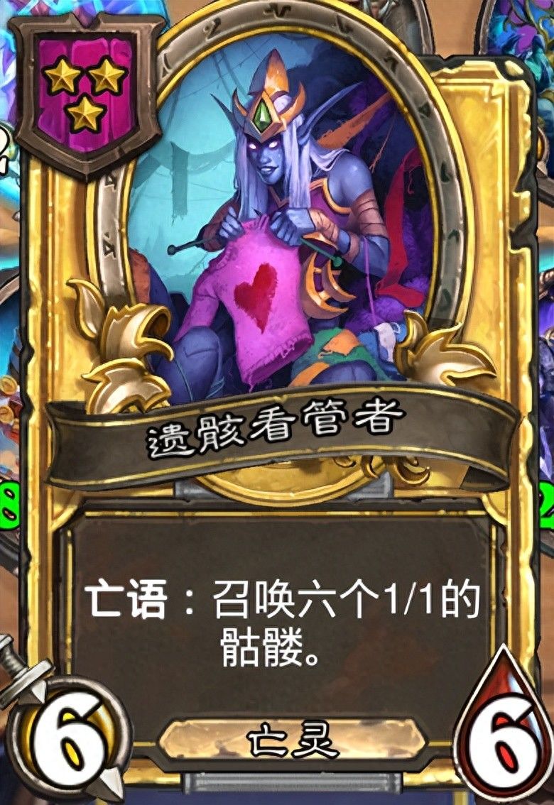 遗骸看管者这个赛季做了小调整,普通等级由原来召唤4只1/1的骷髅,改成了三只,但是金色效果不再是加身材,而是召唤数量翻倍,直接召唤6个1/1的骷髅,本身6/6的身材对这个流派没有任何影响。一次亡语召唤6个随从,对于放不下流来说无疑是个好消息,配合普通瑞文就是11轮buff,加上本身是亡灵属性,而且又在三本,能点金合金也容易,是这个流派最好的触发胚子。
