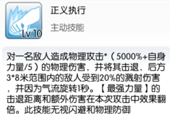 正义执行伤害公式和物理攻击和力量相关,附带溅射效果,并不是单纯的单体攻击,因此联动的 【影.琦玉】卡片可能因为溅射攻击到多个目标失效(卡片单体判定以攻击到的目标数量计算)。