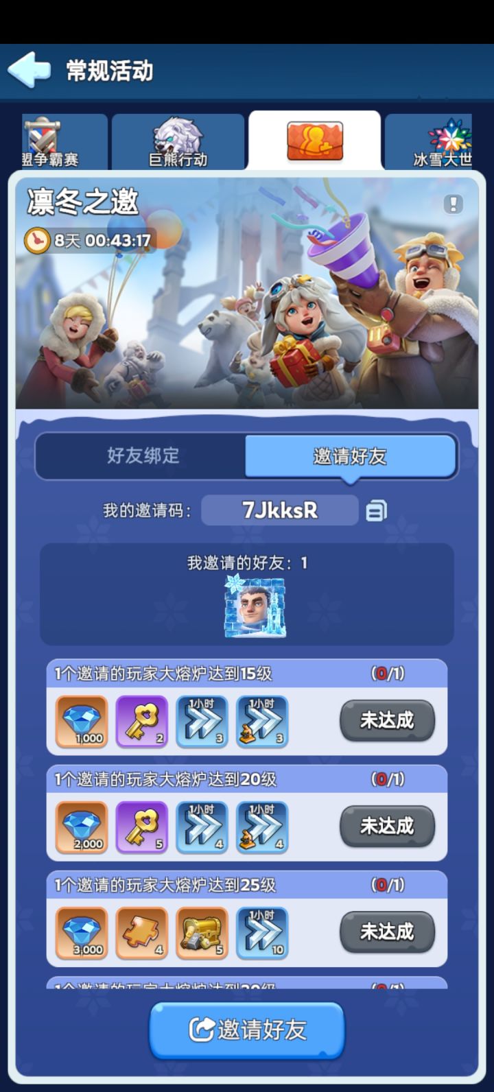 常规活动最后一天>凛冬之邀【好友邀请码】输入: 7JkksR填完立领50000钻石,各种建设加速,凛冬之邀活动里可以绑定拿奖励!秒升30级!!!嘎嘎上堡必定稳拿30级炉子奖励,一起领金钥匙和钻石奖励吧