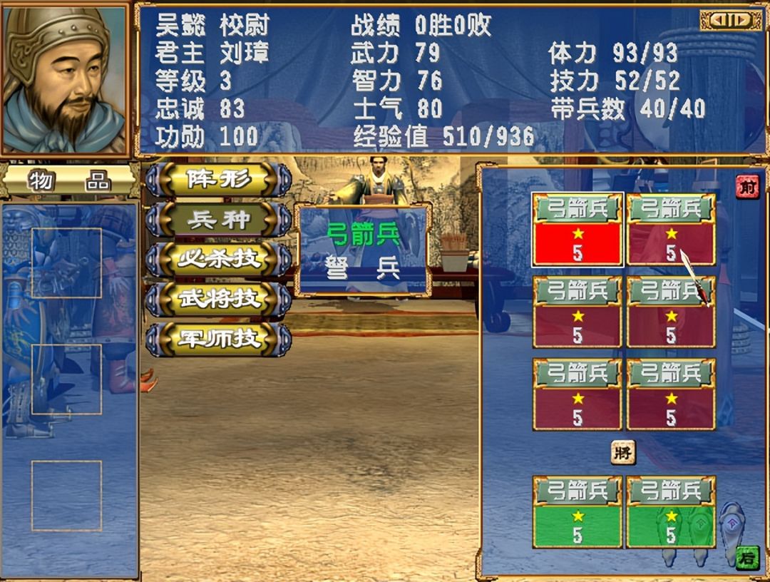 吴兰之所以能入我的法眼,最核心的因素是他能快速解锁八面火。放眼刘璋麾下的其他角色,吴兰是唯一能立马点亮八面火的人,加上他78点的武力值和朴刀兵阵容,完全可以当作特种部队那样以小博大,或者凭一己之力数倍全歼对方的弓兵和弩兵方阵。总而言之,刘璋麾下并不缺少人才,只是因为当年我们玩《三国群英传3》的时候,把过多的注意力投射到了御三家的身上,从而遗憾的忽略掉了。