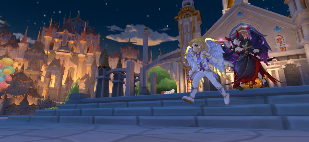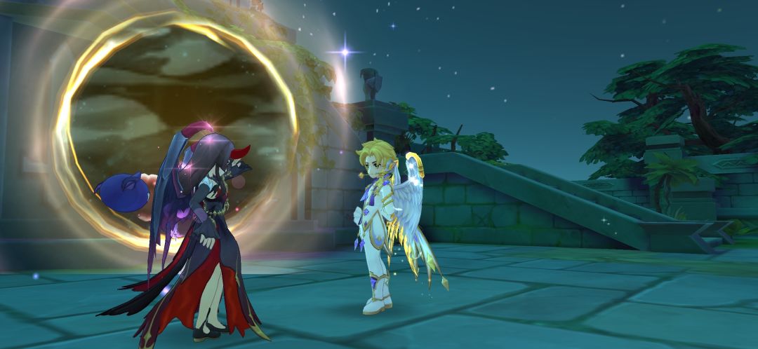 现实中的夜影突然捂住左脸,黑色面纱渗出荧蓝血液。地下水道开始扭曲,石砖缝隙渗出无数苍白手臂。阳光的法杖与刺客的弯刀同时亮起,光暗交融的能量撕开时空裂缝,将他们卷入漂浮着齿轮的机械神殿。