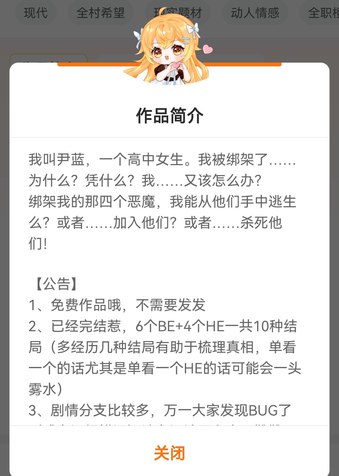 团团尾的另一部作品,上次也推荐了一下,这次详细说说,主角一个女高中生被绑架了,可以靠自己的选择逃出去或…有十个结局可以收集,玩不出来的话可以点开结局,作者直接把攻略写里面了,我目前自己玩收集了三个结局,整体用时不长,故事很完整,推荐!