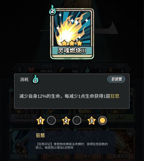 种族专属卡牌:”灵魂燃烧“,通过消减生命获得”狂怒“印记,每层”狂怒“在使用物攻或法术攻击牌时增加对应层数的”怒火(受知识加成)“,每层”怒火“增加1点物理攻击修正(卡牌物理伤害=卡牌基础攻击*物理修正)。这里着重说下,我在打遗迹BOSS时发现身上有”狂怒“,当”怒火“达到9999层时,物理修正不再增加。不知道算不算BUG。