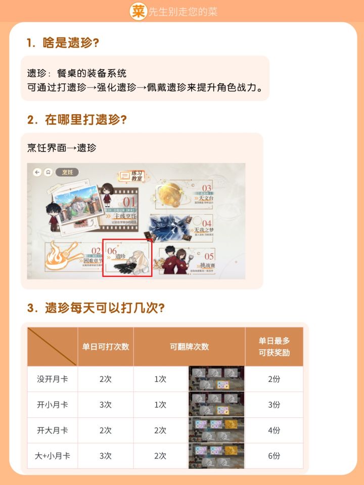 本来对遗珍系统兴趣缺缺,月考分数打不上去也怒了,发现打遗珍是很有用的,尤其当名厨不够、晶辉也点满的了时候……
