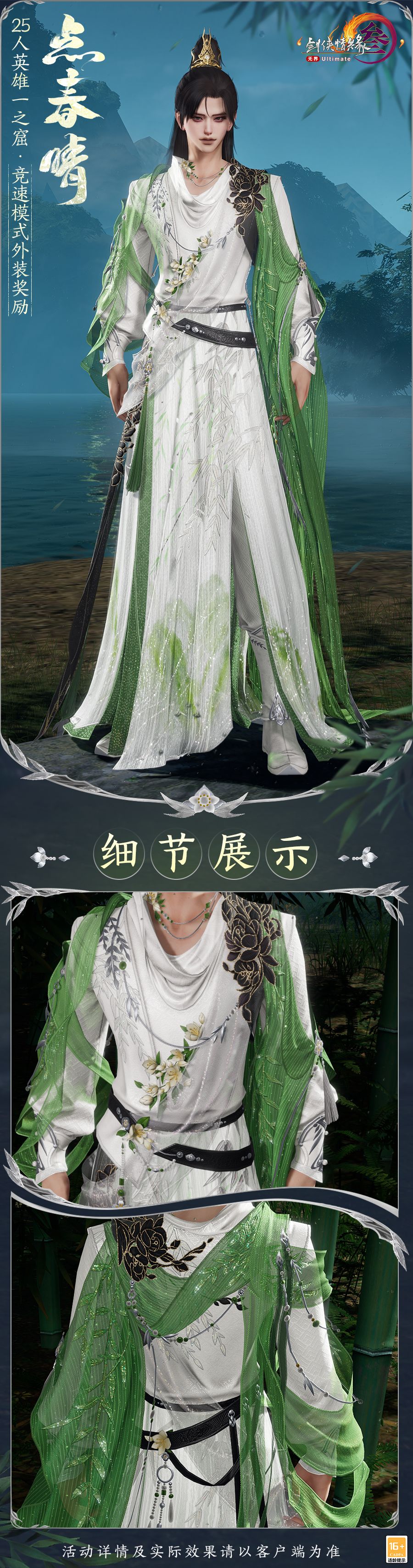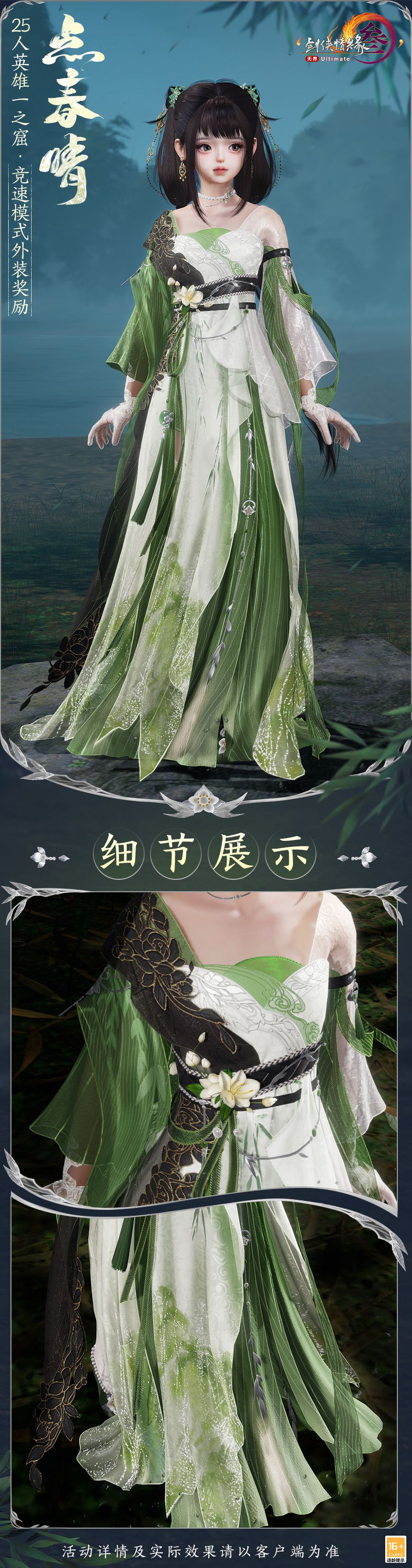 与此同时,外装奖励“点春晴”也将有机会掉落,新资料片开启前其掉落概率还将限时提升!碧纱随风轻摇,衣袂轻盈灵动,腰间缀精巧小花数朵,宛若沙洲春意初绽,烟云袅袅,优雅独具!无界公测后所有赠送外观和掉落外观都采用了售卖外观的同等规格。作为竞速模式中替换的外观奖励,“点春晴”原本属于采用全新标准打造的踏青主题礼盒外观。它既有江湖侠气的墨韵,又有春光烂漫的飘逸。我们将其作为副本掉落奖励,祝愿侠士一路繁花,未来可期!