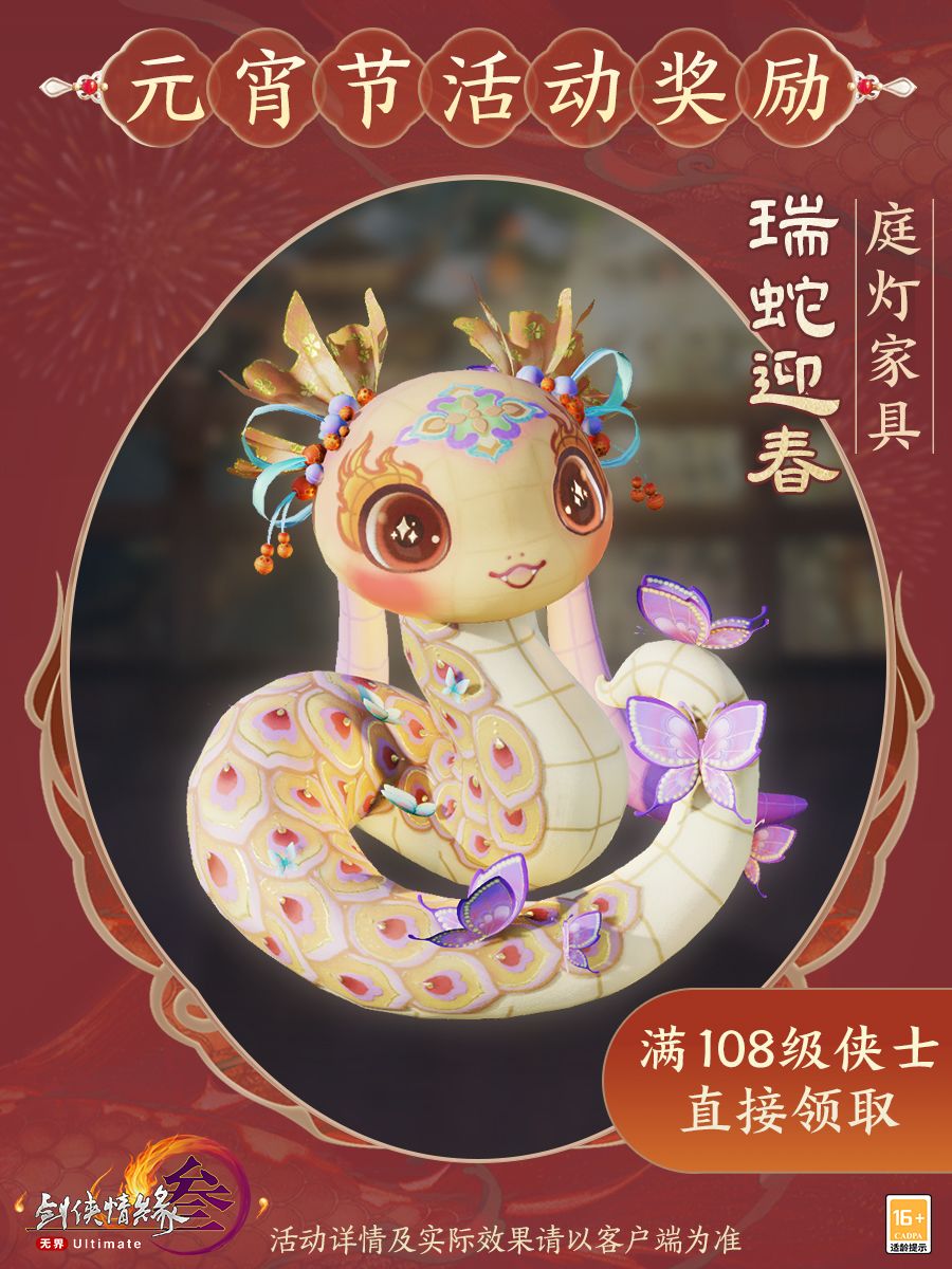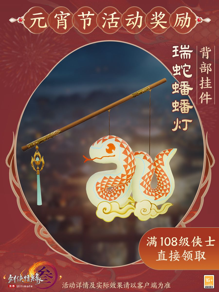 火树银花合,《剑网3》元宵节节日活动在2月10日7:00至2月24日7:00开启!背部挂件“瑞蛇蟠蟠灯”与庭灯家具“瑞蛇迎春”将为侠士带来福运连连,满108级的侠士可在邮箱中直接领取本期全新奖励,轻松拿下!