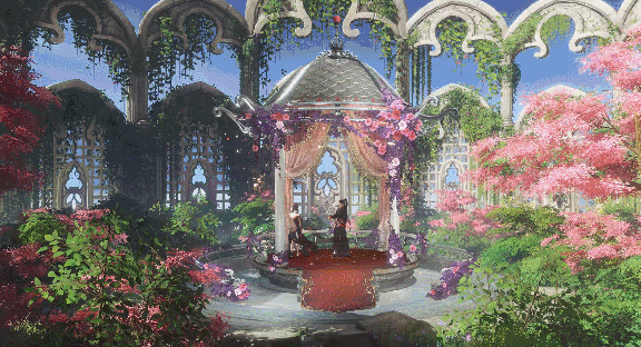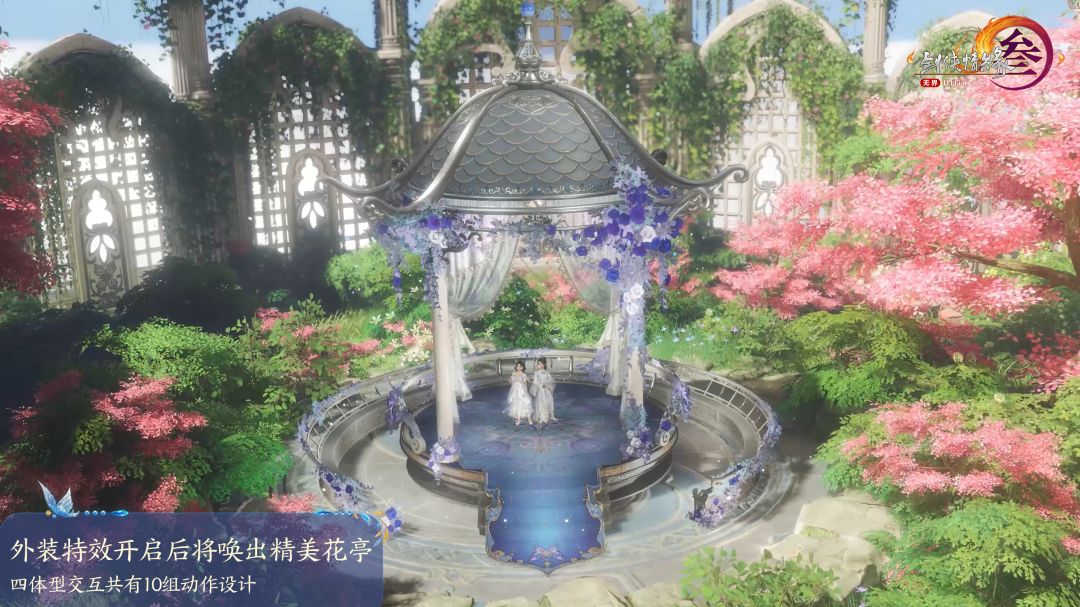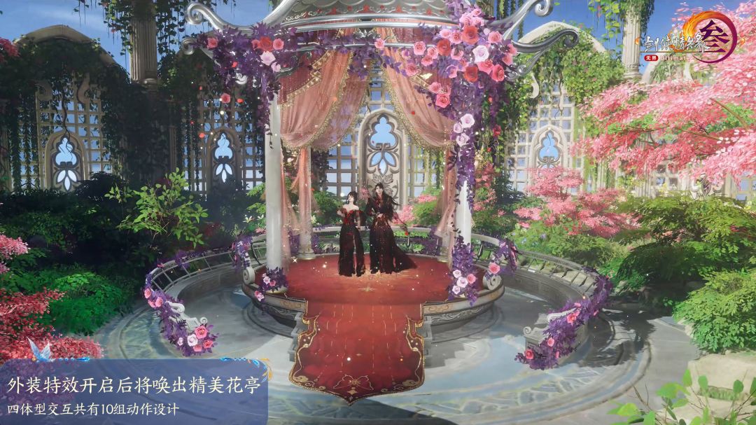 侠士若开启服饰特效将唤出精美花亭,四体型交互共有10组动作设计,与不同体型交互时均有不同表现。使用特效后,亭台显现花枝缭绕,梦幻且华丽。或携手共舞,旋转滑步间,舞姿和谐默契,宛若双蝶翩跹绕飞;或执花相戏,含笑而对,眼中情愫尽显无遗;亦或相拥于怀,将幸福时刻铭记于心……更多精彩,待侠士体验!