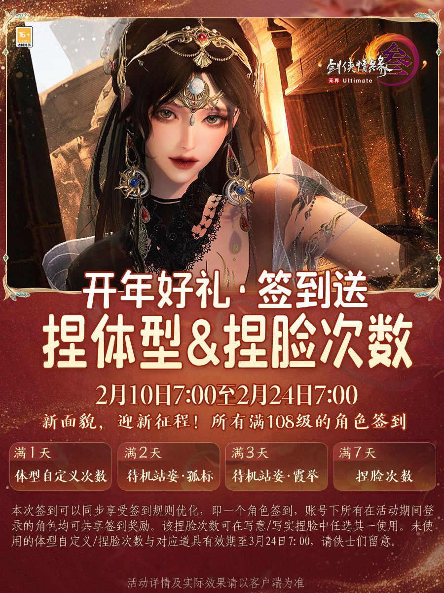 新年伊始,万象更新,开年好礼特别放送!活动期间所有满108级的角色,签到不仅能获得体型自定义次数,和2份全新待机站姿,还有捏脸次数好礼等你拿下!