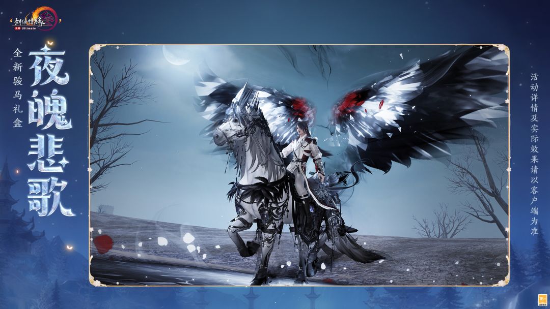 骏马奔驰之时有荆棘玫瑰默然盛放,冰冷铁链惊起蝙蝠若干。荆棘的锋利、玫瑰的傲然、铁链的束缚,骏马嘶叫昂头,血色亦作羽翼光泽,慑人心弦。专属马饰特效开启后,暗色能量波动震荡,琉璃悬窗蜃影忽现,精致线条交织成神秘而又庄严的花纹。光影交错,深邃黑色羽翼倏尔展开,仿佛跃入梦幻之境。