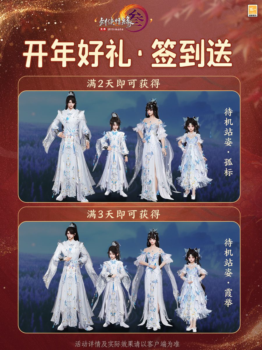 定制待机站姿在场景、商城、装备界面、角色选择界面均支持切换,一展风姿卓绝!只需一个角色完成签到,账号下所有在活动期间登录过的角色都可以共享签到奖励,祝侠士大吉大利,万事胜意!