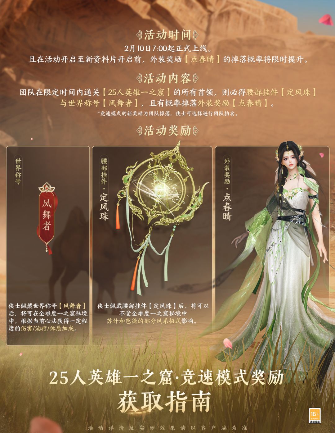 意气凌云,速破黄沙!25人英雄一之窟竞速模式今日正式上线,欢迎侠士们挑战!团队在限定时间内通关【25人英雄一之窟】的所有首领,则必得腰部挂件“定风珠”与世界称号“风舞者”,这不仅能成为侠士成功征服尘沙的传奇证明,还将为侠士后续挑战一之窟带来额外增益效果!