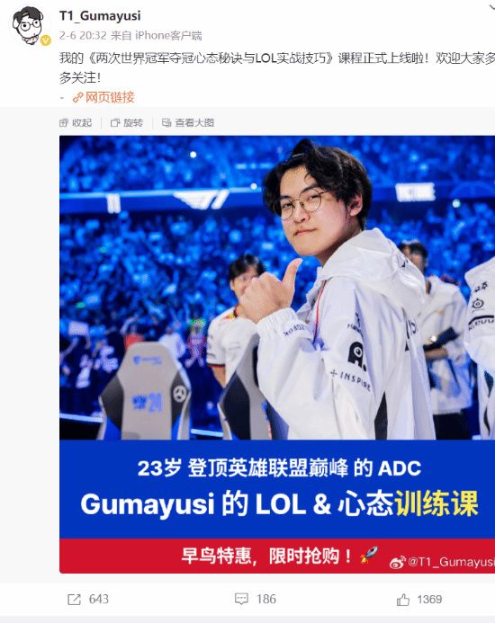 近日,《英雄联盟》T1战队双冠AD选手,被玩家们称为“小吕布”的Gumayusi推出了课程《两次世界冠军夺冠心态秘诀与LOL实战技巧》,预计3月5日早鸟开售,总价234美元,早鸟折扣后为150美元,约为人民币1093元。