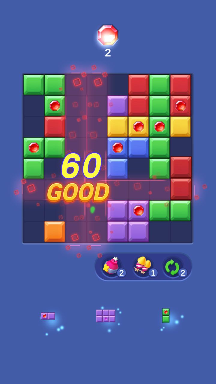 拖拽放置:玩家需将屏幕下方的发光方块拖至棋盘上,目标是使它们与相邻的方块形成完整的一行或一列,从而触发消除效果。