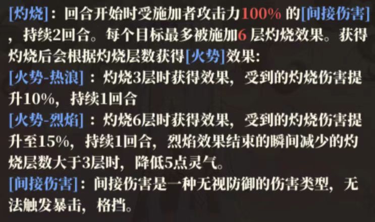 与其他减益类效果不同的是,根据「灼烧」层数的不同还会附加其他的「火势」效果,包括「火势-热浪」和「火势-烈焰」。「火势-热浪」会提高灼烧的结算伤害,「火势-烈焰」会进一步强化「火势-热浪」的伤害提高效果,结算时还将扣除少量灵气。因为火势效果的机制,在战斗中我们需要尽可能调配多方面因素为敌方附加更多层数的「灼烧」效果。