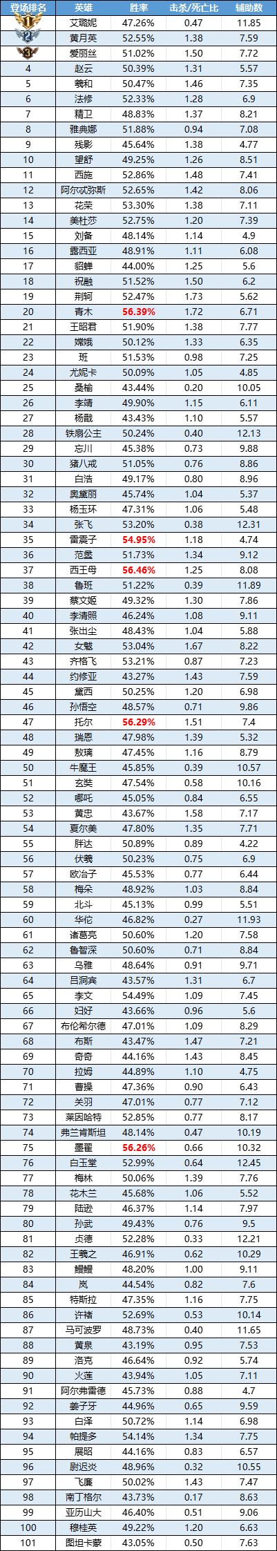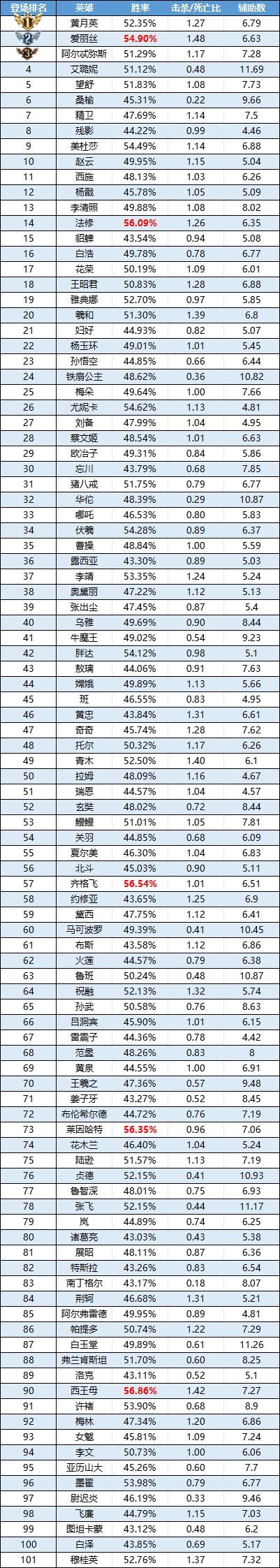 排序:按登场率高低排序,标红为胜率前5