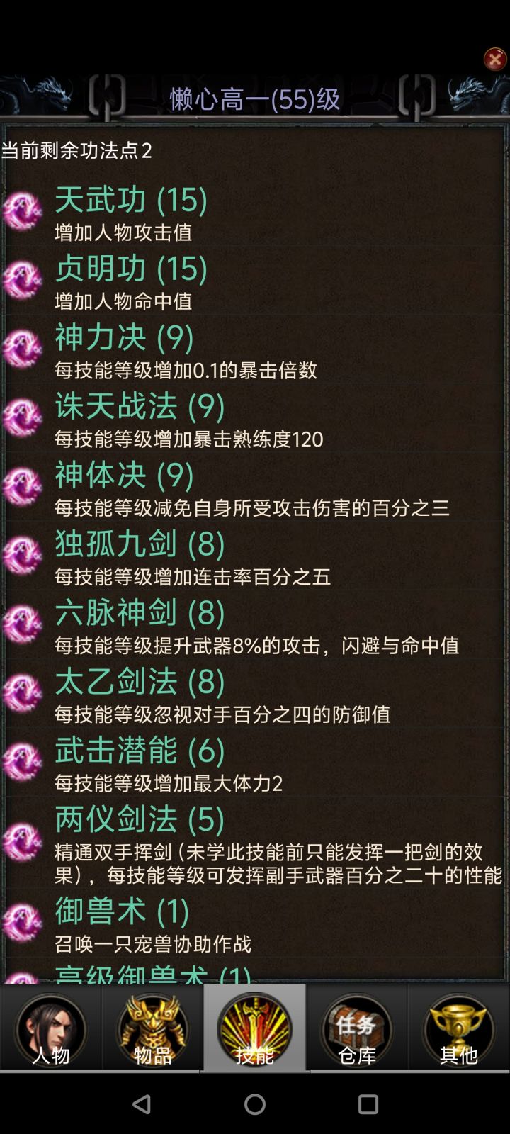 技能选择:两仪剑法、武激潜能、天武功 贞明功、御兽术、神力决 诛天战法、独孤九剑、六脉神剑、高级御兽术、太乙剑法神体决、御兽金身。