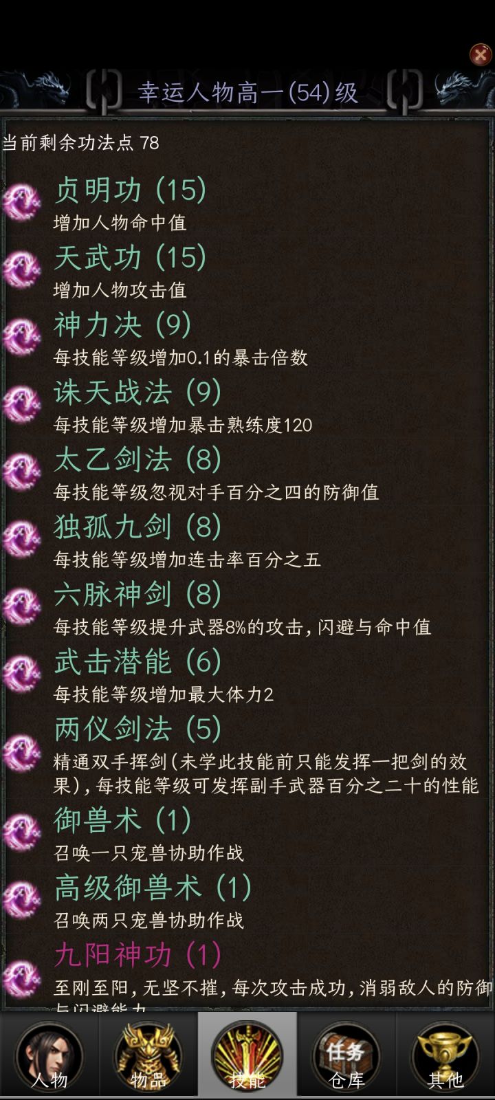 - 属性加点:前期命中、攻击看着点,命中最好是攻击的1.5-2倍,后期也可走高攻击路线。