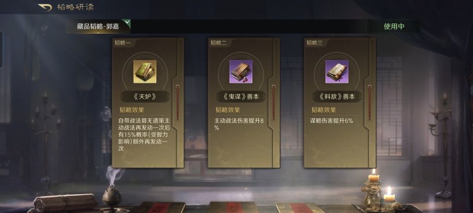 邓艾战法:屯田令+百战不殆+蓄势待发。韬略库:励军善本+济河论(专属)+避勇善本。