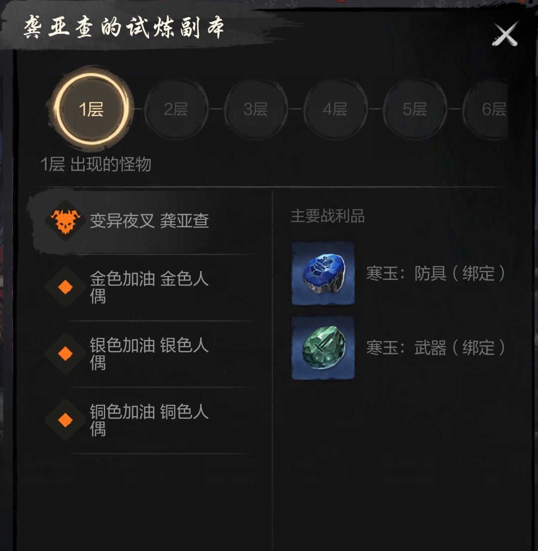 赢得龚亚查试炼挑战,即可获得提升武器与防具的材料道具:寒玉防具(绑定)、寒玉(武器(绑定)、寒玉:武器、寒玉:防具。