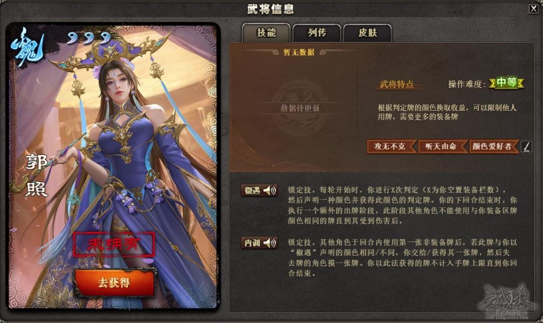 三、身份适应身份局由于【内训】的存在,郭照在场会有很强的存在感——无论谁出牌,都会导致自身和郭照的牌发生流动。这容易导致郭照成为场上的焦点。但这并不妨碍郭照的生存能力。起手的摸牌以及队友间有意识的传牌,能给郭照在回合外提供不错的手牌硬度,足以应付一般的威胁。主公:★★郭照没有卖血技,其防御能力本质上是每轮开始时多摸的判定牌以及通过【内训】从其他角色那里获得的牌。做主公时,自己回合结束会弃掉超过体力上限的牌,使其连回合外多留牌的能力都失去了,不适合。反贼/内奸:★★★★★这两个身份是最适合郭照的,反贼能通过【椒遇】实现队内传牌加团队手牌+1,内奸由于身份灵活,即便【椒遇】无法实现手牌数量的增加,也能通过传递关键牌慢慢平衡场上的局势。自身的手牌厚度也较难被选为集火目标。凭借额外出牌阶段的完杀效果,也能不讲道理地抢人头实现手牌补充,是优秀的反内选手。忠臣:★★★★☆相对于反贼的团队属性,忠臣的郭照在输出能力上会稍显不足。自身有一定的手牌厚度,有不错的防御和双刀能力,也有类似诸葛瑾【弘援】补牌能力,还能在自己额外出牌阶段能强行压血线或收人头,都是合格的忠臣属性。唯一的缺点是嘲讽度不够,反贼或许不会愿意来攻击郭照而更愿意直接推主。