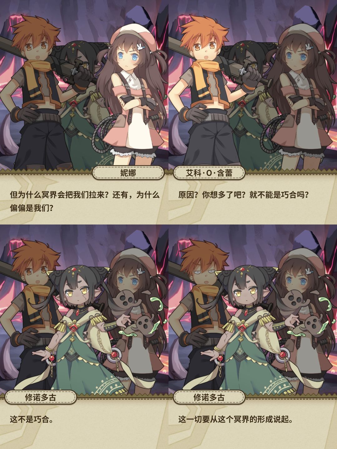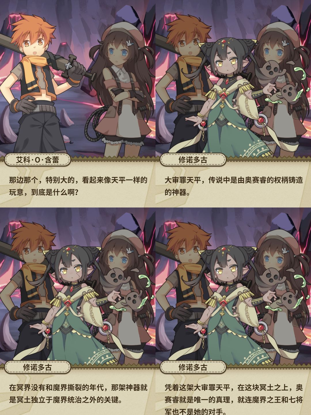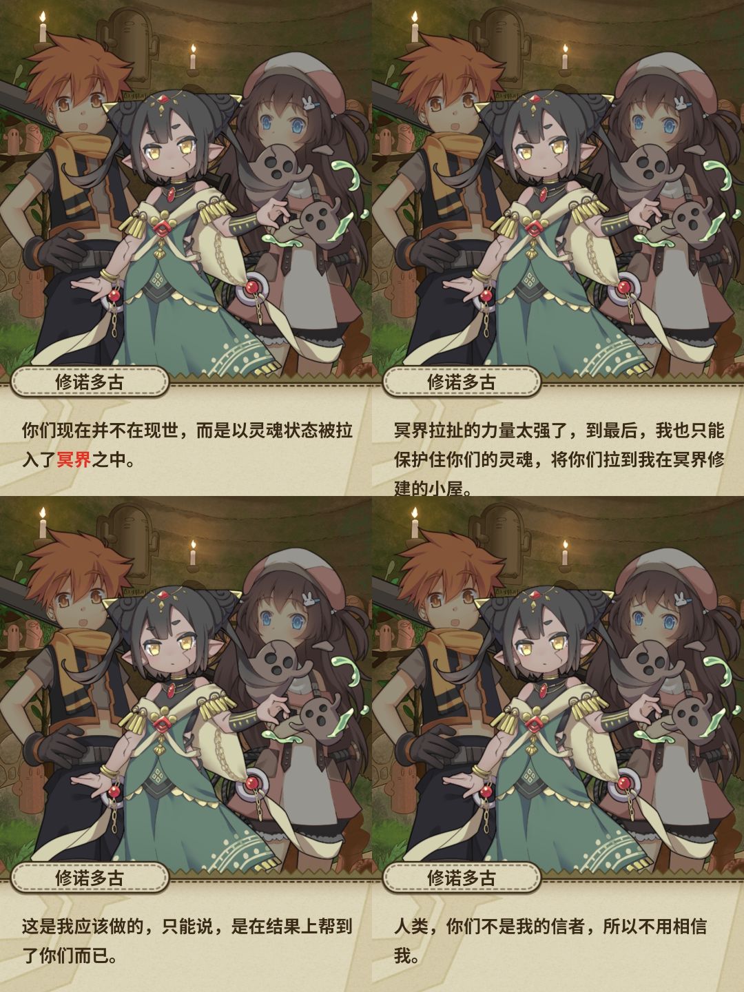 但是主角团为什么会被拉入冥界,地灵神也不知道,这里也解释了冥界的由来,原来也是受到“人外的黄昏”波及,此处也可以看到三界是天界、魔界以及现世![[TapFamily_看戏]](https://img.tapimg.com/market/images/81393719ec733f589d6753db27572595.gif)