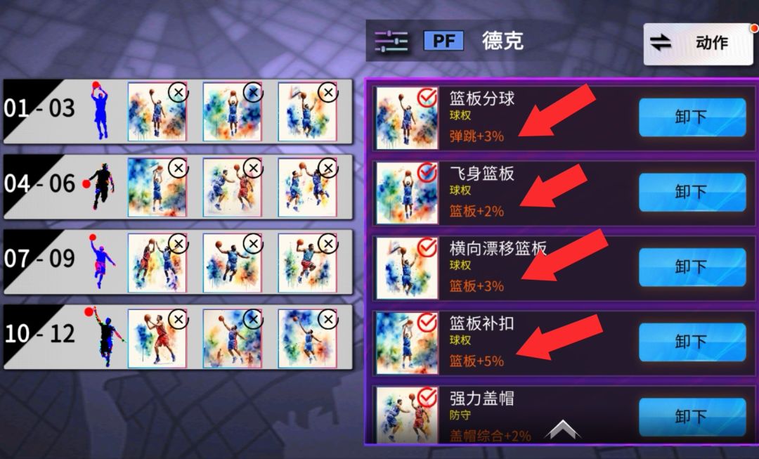 再说说技能机制,游戏中的技能是增加数值百分比的,装备后进入比赛就会生效,且加成数值不在面板显示(动作和数值加成是两回事儿)。PF的篮板技能比C多一个(漂移篮板,触发动作可增加篮板范围),篮板技能全装情况下,德克,锡安,戈登这类弹跳高的PF球员,高板抢不过C属于正常,但抢中、低板往往比C要强,游戏中,中、低板的数量明显是比高板多的。(技能及天赋附图)