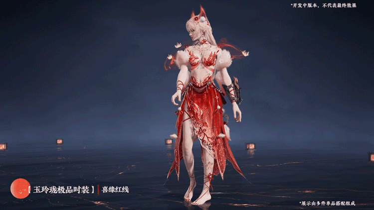 玉玲珑的极品时装“喜缘红线”即将推出。这套时装以传统中国红为主色调,融入精美细腻的金线刺绣,勾勒出龙凤呈祥、繁花似锦的华丽图案,寓意着吉祥如意、情牵一线。女装裙摆轻盈飘逸,仿若天边的云霞,随着角色的移动翩翩起舞,尽显婀娜多姿。