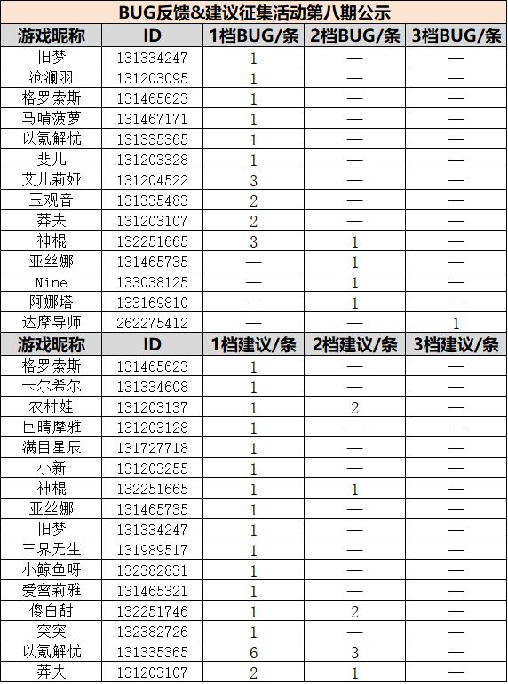 第八期建议反馈活动获奖玩家名单如下,奖励我们于2月11日通过游戏内邮件发放。我们会认真对待每一条建议。请放心,勇士的建议将随着每次版本更新逐步实施。