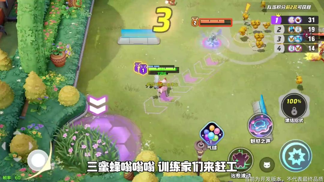 在比赛时,每只普通三蜜蜂的分数为1分,当一定时间后,场地中会刷新体型稍大的三蜜蜂,每只体型稍大的三蜜蜂分数为3分,它们是反败为胜的关键,也是达成得分反超的基础,训练家们一定要好好把握。